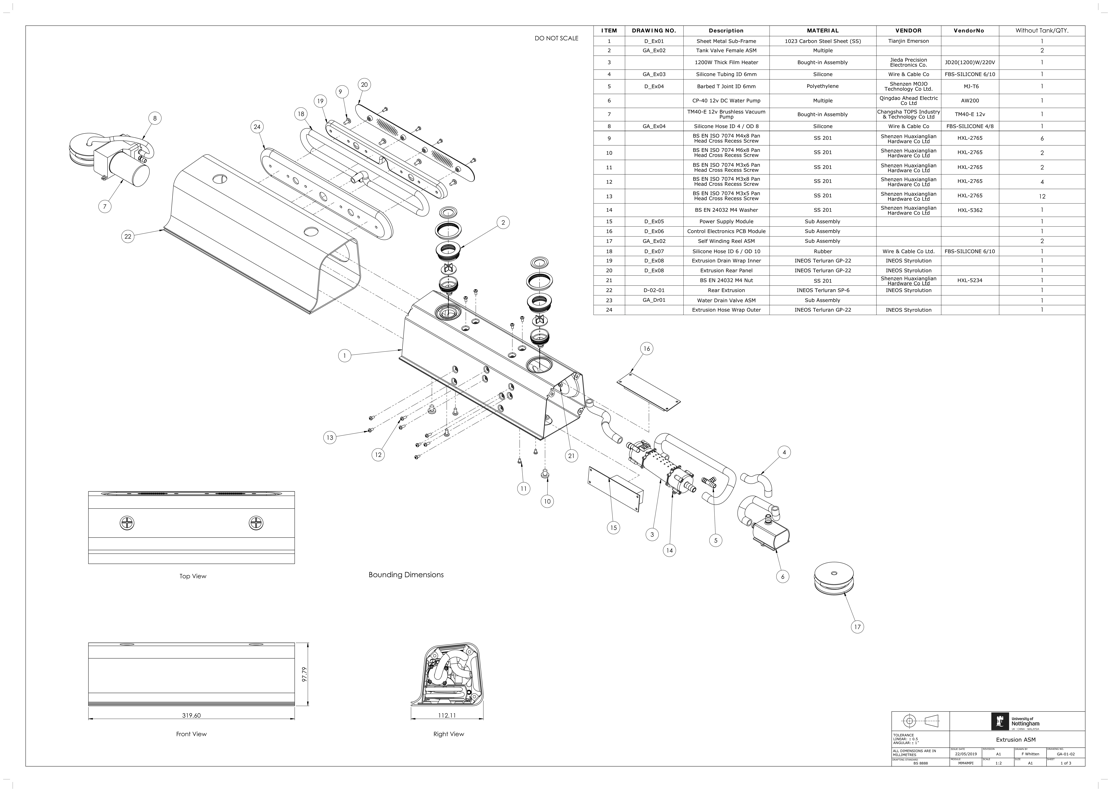 The prototype consists of an acrylic enclosure with a PC water tank. It features a 2200W thick film heating element, brushless water pump, DC vacuum pump, 4x load cells. Temperature readings and control logic is handled by an Arduino which communicates with a Raspberry Pi over serial. The Pi operates the touchscreen interface, displays readings and sends commands to the Arduino.